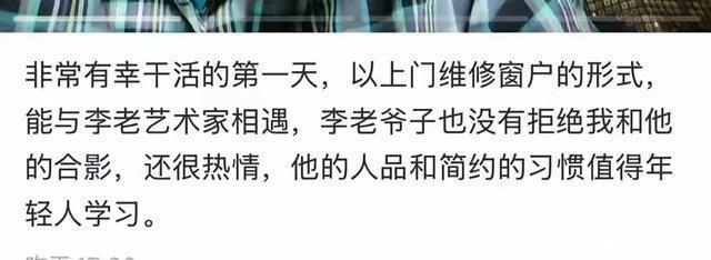 到达目的地的时候,维修工发现面前的这个老人怎么看怎么眼熟,他自己岁数也不小了,总感觉是他那个年代的哪个明星。 只可惜面前这人太老了,他愣神了好一阵才反应过来,这不是宰相刘罗锅么! 维修工在征得李保田的同意之后,俩人拍了不少照片,他还把照片放到网上了。
